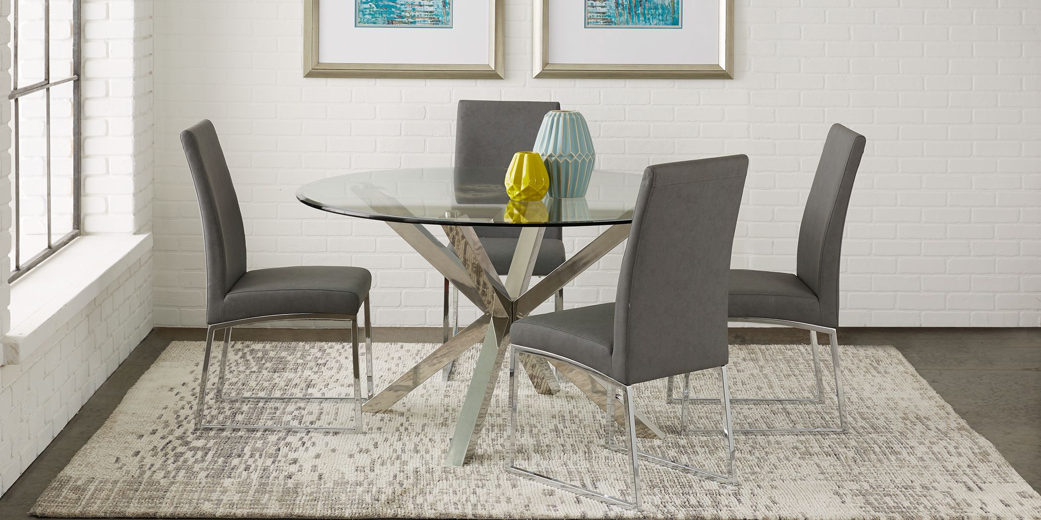 Consider slick faux leather with chrome hairpin legs and consider our grey dining chairs too. Chatham 5 piece dining set. This leather sofa set includes In addition to planked and shaped tops in charcoal grey and weathered crème fronts, there is hidden storage in the long and short. Newjulius oval marble dining table.